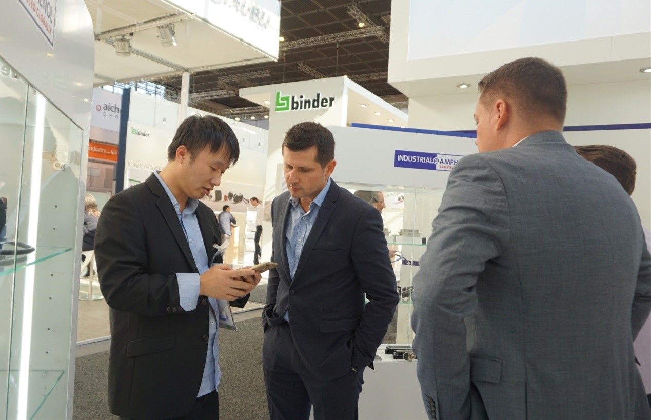 泰通科技董事長(zhǎng)吉榮新、總工程師陳建平與行業(yè)其他展商洽談