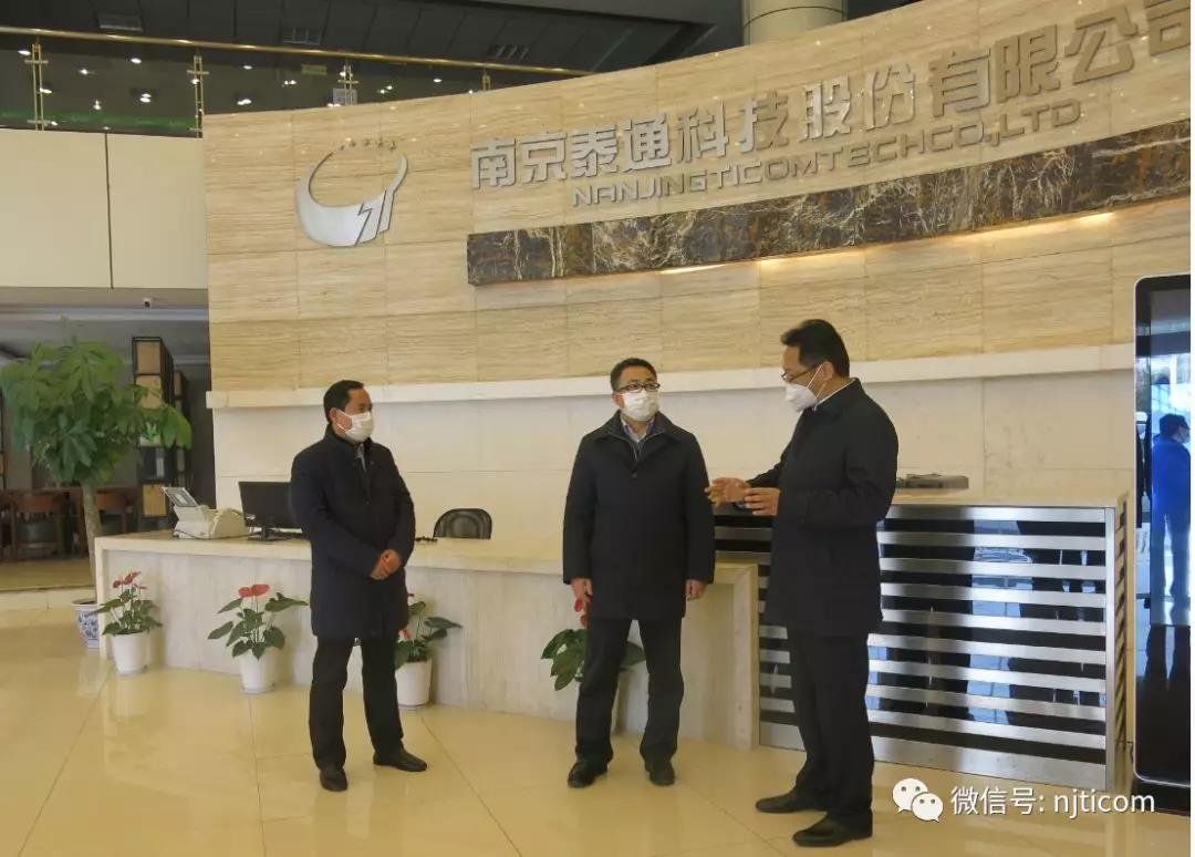 2020年2月19日,南京市雨花臺區(qū)區(qū)長副書記張連春、副區(qū)長雨花經(jīng)濟開發(fā)區(qū)黨工委書記張建設(shè)、軟件谷管委會副主任卞艷艷一行至泰通指導(dǎo)疫情期間企業(yè)復(fù)工情況,泰通科技董事長吉榮新進行了匯報。