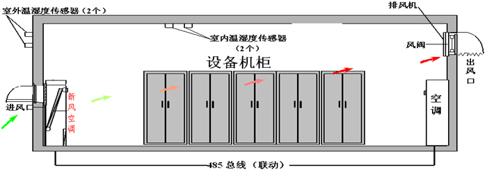 工作原理:模塊新風空調(diào)設備是結合新風與空調(diào)控制,對機房進行熱功控制的系統(tǒng),當室內(nèi)溫度達到22℃(可設置),室內(nèi)外溫度差△T≥2℃,模塊新風設備開啟,向室內(nèi)送入過濾后的冷空氣,室內(nèi)溫度降至18 ℃時,模塊新風停機;如室內(nèi)溫度繼續(xù)上升至25 ℃時,模塊新風停機,模塊精密空調(diào)啟動制冷工作,室內(nèi)溫度降至23 ℃時,模塊精密空調(diào)停止工作,等待下一個工作流程,以此循環(huán)工作。