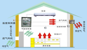 工作原理:智能新風(fēng)系統(tǒng)通過引入室外冷空氣,對機(jī)房溫度進(jìn)行調(diào)節(jié),當(dāng)室內(nèi)溫度達(dá)到22℃(可設(shè)置),室內(nèi)外溫度差△T≥2℃,智能新風(fēng)啟動(dòng),向室內(nèi)送入過濾后的冷空氣,室內(nèi)溫度降至18℃(可設(shè)置)時(shí),智能新風(fēng)停機(jī),以此循環(huán)工作。